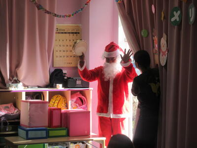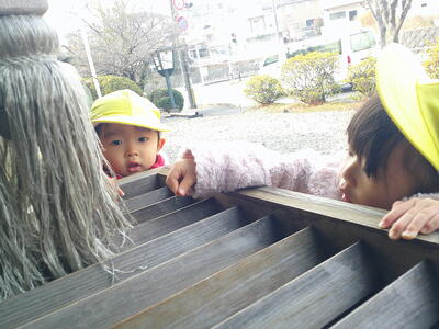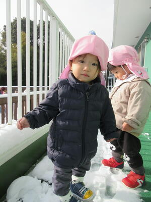 おやつの後に、待ちきれずにウッドデッキに飛び出した2歳児さんからは、0歳児さんに雪のお届け物。生まれて初めて見る雪にびっくりでしたよ。