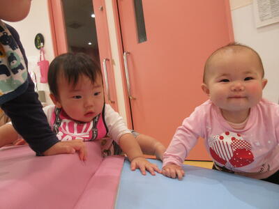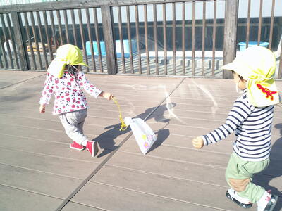 0歳児 うみチームさんは保育室のベランダでも遊びました。