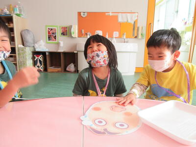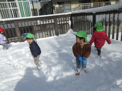 4歳児・5歳児は雪合戦や雪の上での追いかけっこなど、ダイナミックな遊び楽しみました。また、みんなで力を合わせて大きな雪ダルマを作り。「鼻はやっぱり人参やんな」「目はどうする?」「ペットボトルの蓋は?」・・・あれこれ相談しながら完成させていました。
